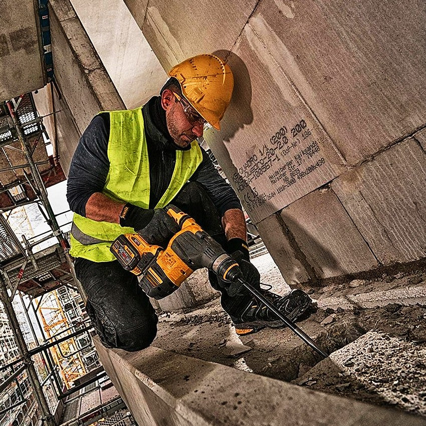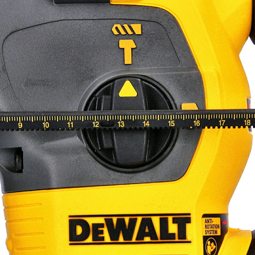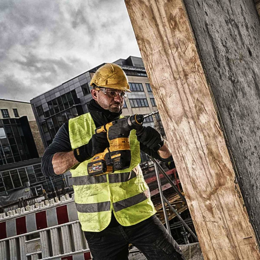 Dewalt 54V XR Borhammer DCH333NT med SDS-Plus-feste som klarer betongboring opptil 30 mm. Den har en slagstyrke på 3,5J og opptil 4480 slag/min.