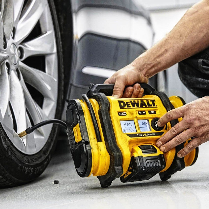 Dewalt 18V XR Luftpumpe/Kompressor DCC018N har en Høykvalitativ LCD-skjerm og er enkel å bruke. Måler BAR / kPA / PSI. Kan brukes med 18V XR Batterier og 230 V. Blåser raskt opp ting som dekk osv. (størrelse 235 / 70R17, 400 sekunder). Etterlater 0,35L/min 6,2 bar og 0,6l / min 2 bar for rask oppblåsing. Maksimalt trykk er 11 bar. Fleremåleenheter (BAR, kPa, PSI) for enkel bruk og nøyaktighet. Digitalmåler med automatisk avstenging muliggjør forhåndsinnstilling til ønsket PSI- og trykkverdi for. Automatisk avstenging hindrer overtrykk. Inkluderer innebygd lagring av en høytrykksslange. Presta-sykkeladapter og ballnål for allsidighet.