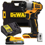 Dewalt 18V XR Slagskrutrekker DCF840E1T med børsteløs motor og som er veldig praktisk i bruk. Slagskrutrekkeren har 1/4 "(6,35 mm) "drop in"-bitsholder som forenkler rask montering med kun én hånd og har en kompakt design til tross for høy effekt med kullbørsteløs motorkraft med opptil 192 Nm dreiemoment. 3200 rpm sikrer at arbeidet fullføres raskt og 3 x LED "Halo" lysringen gir utmerket arbeidsbelysning.