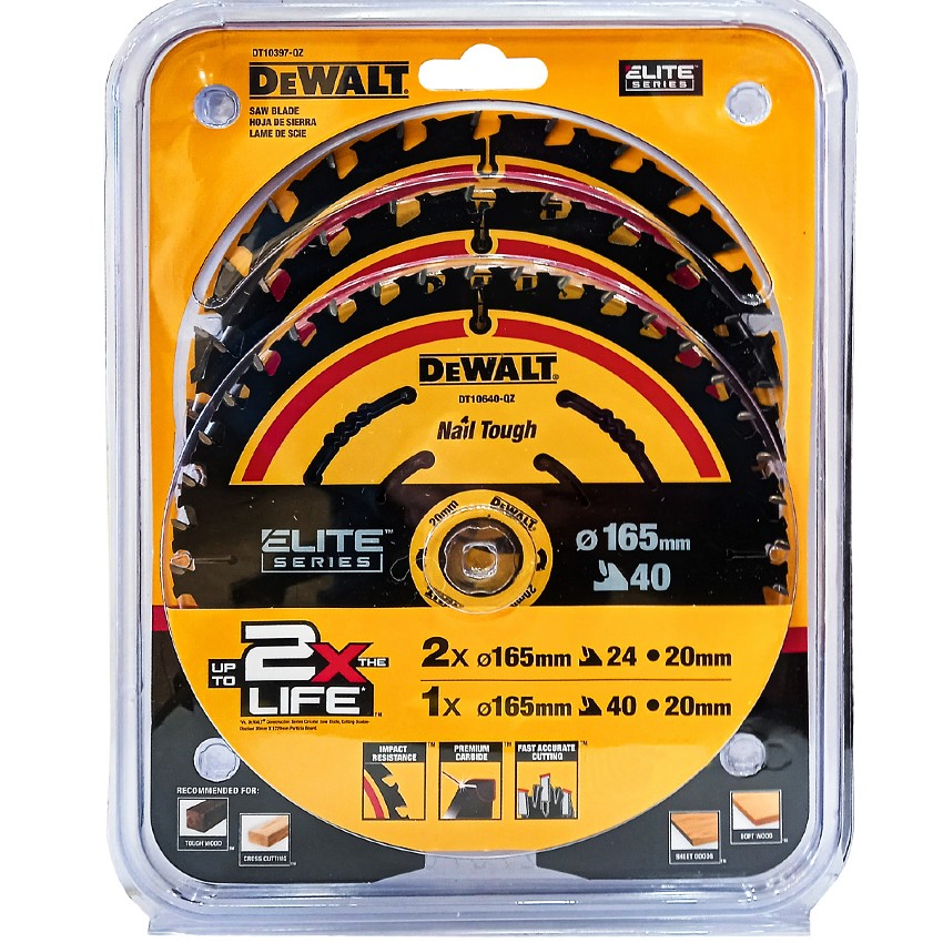 Pakken inneholder Dewalt Elite Series 2 stk 165x20x24T og 1 stk stk 165x20x40T