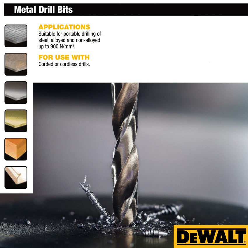 Dewalt Metallbor DT5209. Presisjonsslipt spiralbor for hurtig boring, lang levetid og utmerket tetthet. Produsert av høyhastighetsstål i henhold til DIN338. Slipet av et massivt stykke, høyreskjærende spiral med type N spor, presisjonslipet med 118gr. spissvinkel.